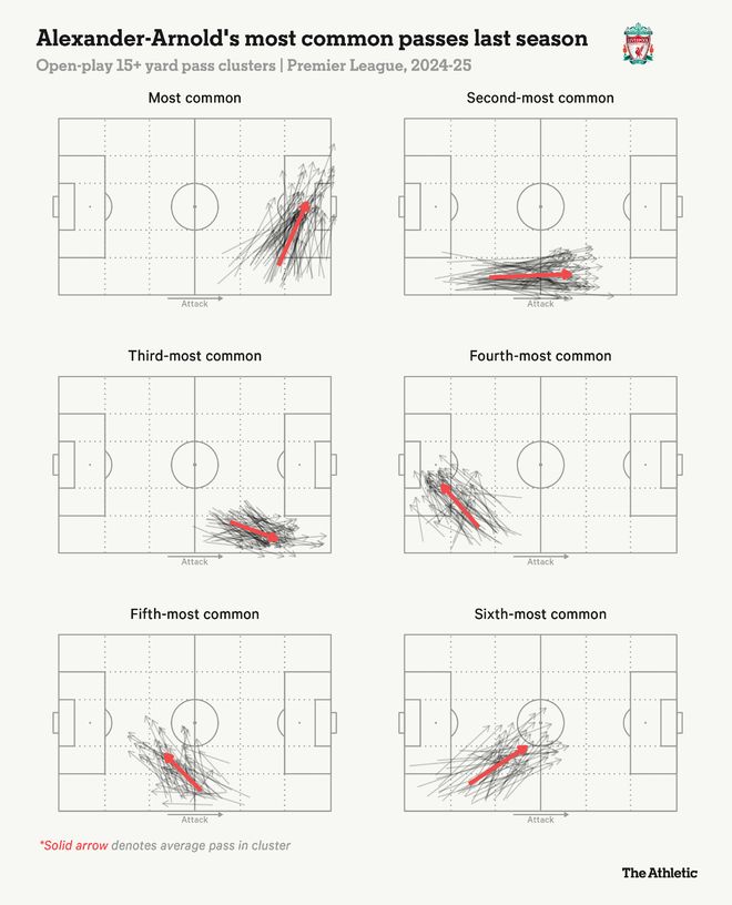 下圖突顯了阿諾德上賽季最頻繁的長傳(超過15碼),展示了那些快速傳中對禁區內的威脅。
